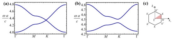 - Lannebère, S.; Silveirinha, M.G. Link between the photonic and electronic topological phases in artificial graphene. Phys. Rev. B 2018, 97, 165128. [Google Scholar] [CrossRef] [Green Version]