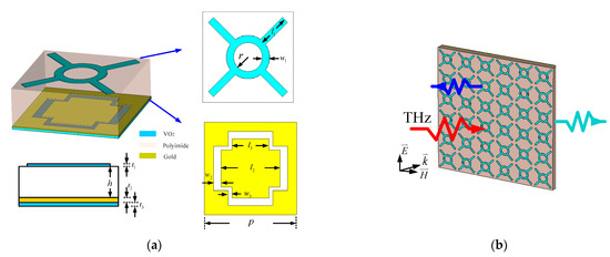 To solve these problems, phase-change materials (PCM), for instance, graphene [30,31], liquid crystal [32], and vanadium dioxide (VO2) [33], have attracted extensive attention due to their unique electromagnetic and optical performances that can be directly controlled by adopting external excitations, making them a potential new way to manipulate THz waves. Among them, VO2 is more preferable to implement a dynamic modulation response in THz frequencies for its electrical and optical characteristics near room temperature. VO2 can achieve an ultrafast [34] and brutal reversible metal–insulator transition (MIT) from insulator to metal provoked by thermal [35], electrical [36], or optical [37] stimuli. Although the active modulation can be faster and more efficient if excited by the electrical or optical method as compared to thermal excitation, electrical stimuli need a complex biasing network and then, the fabrication difficulty would increase significantly in the THz regime. Meanwhile, the external laser source is required for applying the optical method, making the operating system bulky and the cost high. Thus, thermal excitation is an ideal choice for modulating the property of VO2. There is a dramatic variation in the electrical and optical performance during the phase transition (4–5 order of magnitude change on the electrical conductivity ), so VO2 is a promising candidate in tunable MM devices at THz frequencies to achieve excellent modulation characteristics. Therefore, VO2 is of crucial importance and can be employed in THz devices to tailor various performances. Indeed, a lot of research fields have been focused on VO2-based tunable devices to obtain adjustable and switchable functions, such as reconfigurable THz filters [38,39,40], polarization converters [41,42,43], tunable THz absorbers [44,45,46], and so on. However, to the best of our knowledge, few works have been presented to achieve multiple functionalities that can be dynamically adjusted in THz devices.