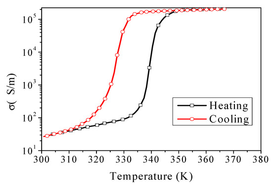 Figure 2 illustrates the experimental results of the conductivity of VO2 for different temperature states. From the results, it is worth noting the conductivity of VO2 can change from 25 S/m at 300 K to 2.5 × 105 S/m at 370 K during the phase transition. When the temperature is above 350 K, the conductivity is over 2 × 105 S/m. Therefore, in simulation, the conductivity () of VO2 is assumed in the range from 25 to 2 × 105 S/m.