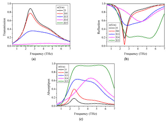 The simulated frequency responses under different conductivity values are described in Figure 3. In Figure 3a, there is a transmission peak appearing at the frequency of 2.5 THz; the transmission coefficient gradually decreases as the conductivity of VO2 () increases, and when is above 2 × 103 S/m, the transmission peak almost disappears. Then, as the value progressively goes from 25 to 2 × 105 S/m, the transmission coefficient would slowly decrease from 0.9 to nearly 0, the amplitude modulation depth of transmission is approximately 200% at 2.5 THz, and so do the reflection results accordingly, as shown in Figure 3b,c; this obviously demonstrates that this design can achieve dynamically tunable absorption property under normal incidence across the whole frequency band of 0.5–7 THz by changing the conductivity of VO2. There is a wide absorption bandwidth in the frequency band ranging from 2.52 to 6.06 THz with the fractional bandwidth of 82.5%, as the absorptance is more than 0.9 when = 2 × 105 S/m. However, in the insulating state ( = 25 S/m), VO2 behaves like the insulator and the incident EM waves can transit with low insertion loss, so then this design can act as a bandpass FSS. When it is in the metallic state ( = 2 × 105 S/m), VO2 can be regarded as metal; the majority of incident EM waves would be reflected by the bottom VO2 film, and then absorbed by the top VO2 resonator due to ohmic loss to realize the wide absorption performance. The above results clearly indicate that this design achieves the adjustable and switchable functions by controlling the characteristics of phase transition of VO2 material.
