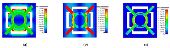 At the frequency of 2.5 THz, from Figure 4a, the electric field is mainly distributed on the upper and lower edges of the loop-shaped aperture of the FSS layer to form the resonance and the incident waves can be allowed to pass through the structure. There exists a small part of the electric field on the top resonator, which is the reason for insertion loss at the passband. Thus, the design can produce an EM transparent window at 2.5 THz with an insertion loss as = 25 S/m. In Figure 4b, it can be seen that the electric field is mainly focused on the four arms of the top resonator at 3.1 THz. For the frequency of 5.3 THz, an amount of the electric field is concentrated on both left and right sides of the circle of the top layer, as illustrated in Figure 4c. The electric field distributions indicate that the absorption mainly comes from the ohmic dissipation of the top VO2 resonator when = 2 × 105 S/m for these two frequencies.
