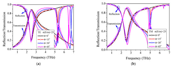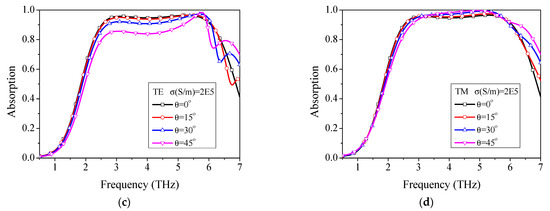 Figure 5 depicts the oblique incidence properties for two different conductivity states in both cases of TE and TM polarizations. From the above results, it is seen that this design maintains relatively robust angular stability at the passband of 2.5 THz over the incident angle (, the angle between the incident wave vector and the z-axis), ranging from 0° to 45° for both TE and TM waves in Figure 5a,b with = 25 S/m. However, some harmonics are appearing at the higher frequencies for both cases, as is greater than 15°, which is attributed to the mutual coupling between adjacent units. Figure 5c,d describes the absorption responses against the incident angle () as = 2 × 105 S/m. In TE mode, the absorption gradually deteriorates when goes up to 45° at the lower absorption band with the absorptance > 0.8, as plotted in Figure 5c. It can be ascribed to the fact that the parallel E-field component gradually decreases with increasing . On the contrary, the absorption performance almost remains stable even though reaches up to 45° for the TM mode because the parallel E-field component stays nearly unchanged. From the above results, for the TM mode, the design has good angular stability on absorption performance as compared with that in the TE mode when increases up to 45°, as detailed in Figure 5d.