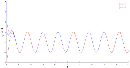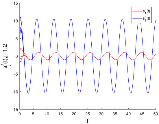 By utilizing Theorem 1, the NTINNs (40) possess a globally exponentially stable -periodic solution , and all solutions of (40) and their derivatives are exponentially convergent to and , respectively. The simulation results of Figure 1 and Figure 2 show that the theoretical analysis is consistent with the numerical observation results.