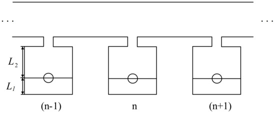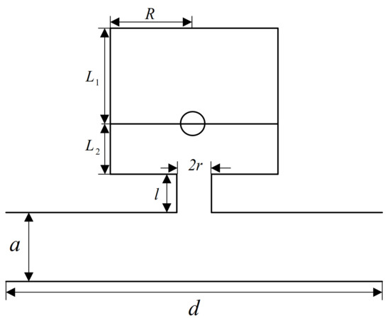 This work proposes an acoustic pipe with the periodical configuration of multiple local resonance cavities, and introduces the single cell of the pipe; see Figure 1. The multiple local resonant cavity is composed of a thin plate with a mass m inserted in the cylindrical Helmholtz cavity. The distance between thin plate with mass and the top is . The distance between thin plate with mass and the neck is . The radii of the thin plate and Helmholtz cavity are both R. The thickness, Young’s modulus, and Poisson’s ratio are E, and , respectively. The radius and length of the Helmholtz cavity’s neck are r and l, separately. The section of the main duct is a square of length a. The length of a single cell is d.