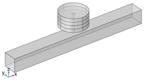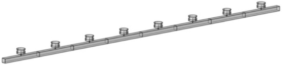 Figure 6 shows a sketch of the proposed acoustic pipe. Multiple local resonant cavities are arranged at fixed intervals of 0.5 m along the square duct in the section area of . This paper uses an acoustic pipe with eight local resonant cavities as an example for discussion. The finite element model is shown as Figure 7.