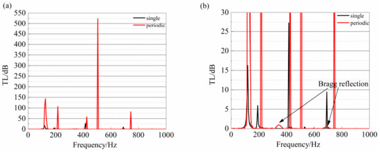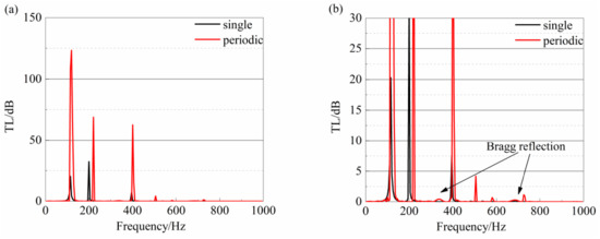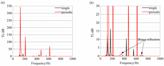 Multiple local resonant cavities with three plates and masses are arranged at fixed intervals of 0.5 m along the square duct. The paper uses an acoustic pipe with eight local resonant cavities as an example for discussion. The transmission loss of the acoustic duct is shown in Figure 37a and the enlarged view is shown in Figure 37b. It can be concluded from the enlarged view (Figure 37b) that the peaks of the transmission loss curve of the periodic duct appear not only close to the peaks of the original cell but also to the broad-band sound absorption segment caused by Bragg scattering. Additionally, the frequencies of the broad band satisfy Equation (14), which demonstrates that the proposed acoustic duct can make the natural frequency move to the lower range and perform more effective low-frequency sound absorption.