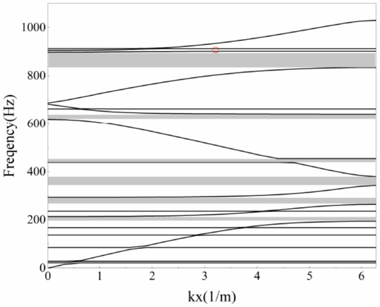 By selecting the two-dimensional resonant cavity cell with the same parameters (see Figure 9), the band structure can be calculated, as shown in Figure 10. The band gap in the energy band structure diagram is indicated by the gray area and the red circle. Its periodic pipeline transmission loss is shown in Figure 11.