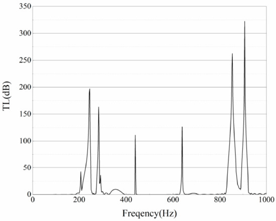 The transmission loss curve of the proposed pipe system is shown as Figure 8a, the enlarged view of the curve in the frequency between 300 Hz and 800 Hz is shown in Figure 8b.