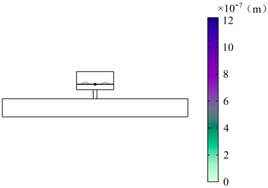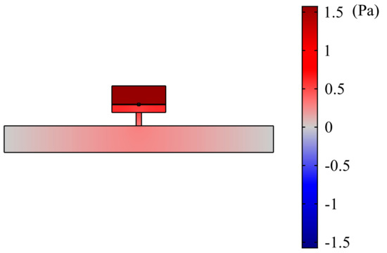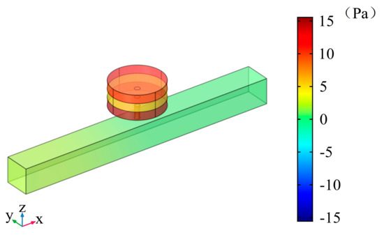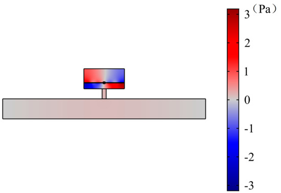The fifth peak appears at 690 Hz. The vibration response of the plate is shown as Figure 26. The transverse displacement of the circular plate varies with the radial direction, as shown in Figure 27. The sound pressure distribution of the cavity is shown in Figure 28. It is found that two plates vibrate in the opposite direction but their vibration displacements are the same. Therefore, the fluid in the top and bottom cavities is compressed and the middle fluid is stretched. The cavity and the neck, or the plate with mass, form the spring–mass system and the fluid in the cavity is compressed/stretched means the shape change of the corresponding spring. The volume of the cavity changes represents the vibration of the spring–mass system. When the kinetic energy and potential energy both reach the maximum, the cavity stores the energy from the duct. The energy attenuation appears while it leaves the duct, and then forms a peak.