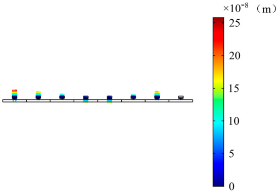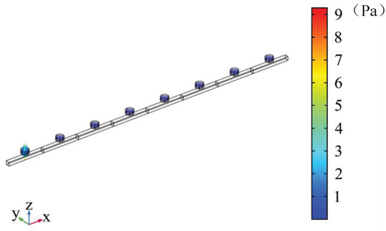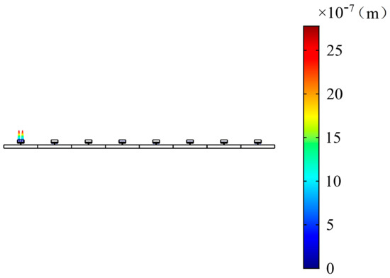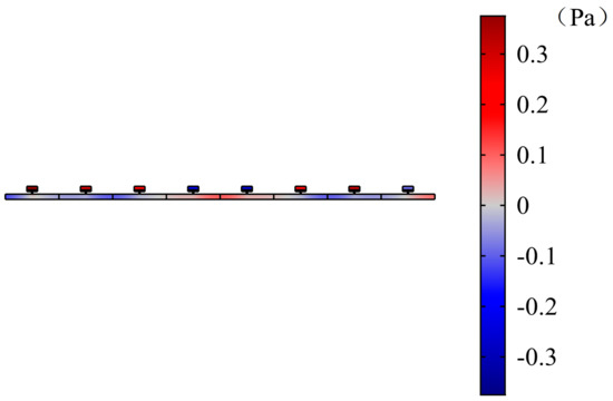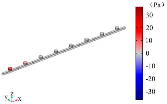 According to the energy band structure diagram, the first energy band for analysis is chosen. The upper and lower limits of the first energy band are 194.45 Hz and 213.69 Hz, respectively. When the wave number is , the mode of the unit cell is observed at the frequency of 194.45 Hz. It is found that the mode of the unit cell at this time is mainly represented by a flat plate (see Figure 16 and Figure 17). The flat plate vibrates and stores energy in the pipe. The sound pressure in the unit cell is mainly concentrated in the upper cavity. When considering periodic pipelines, at 195 Hz, the sound pressure is concentrated in the cavity of each cell, and, in Figure 18 and Figure 19, the sound pressure in each upper cavity is presented in a darker color than that in the pipeline, which corresponds to the high sound pressure in the legend. Additionally, the sound pressure distribution of the first unit in the periodic pipe is very similar to the sound pressure distribution of a single cavity. The response of the total slab of the periodic pipe is observed. The first unit cell has the largest response, and the deformation is similar to the mode.