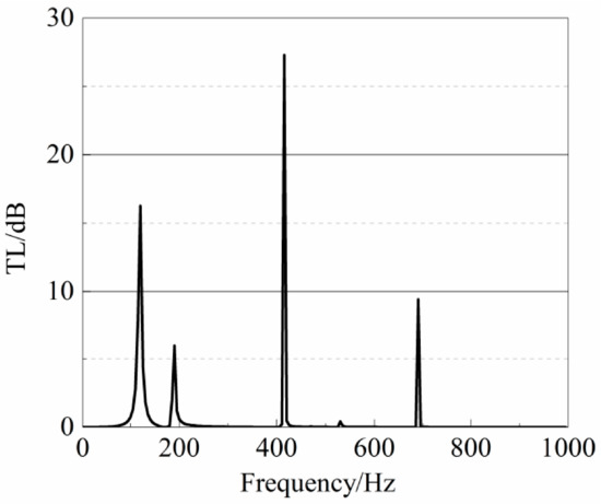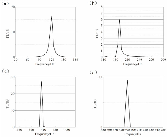 The transmission loss of the multi-local Helmholtz resonant cavity with two plates with mass reaches 16.26 dB at 120 Hz (see Figure 22a), 5.98 dB at 190 Hz (see Figure 22b), 27.30 dB at 415 Hz (see Figure 22c), and 9.41 dB at 690 Hz (see Figure 22d).