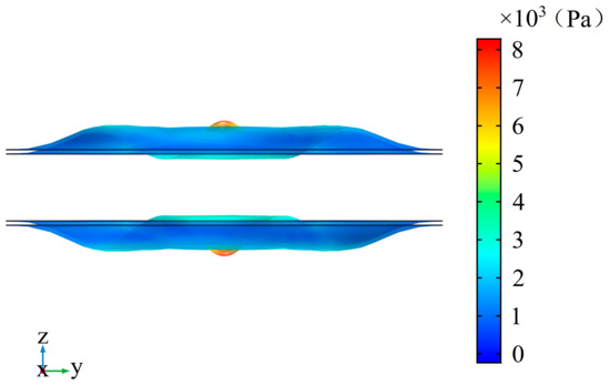 The upper and lower cavity and the two plates form the spring–mass system separately. The vibration process of the spring–mass system is the transformation of kinetic energy and potential energy. When the lower fluid is stretched, the equivalent spring is stretched. The energy of the lower plate and lower cavity mostly transforms into potential energy. When the top fluid is compressed, the equivalent spring is compressed. Additionally, the energy of the upper plate and top cavity mostly transforms into potential energy. The middle fluid behaves as a spring. In this process, the volume of the middle fluid changes minimally. This means the potential energy of the equivalent spring in the middle fluid is at the minimum while the kinetic energy is at the maximum. In this case, the kinetic energy and potential energy of the system reach their maximum.