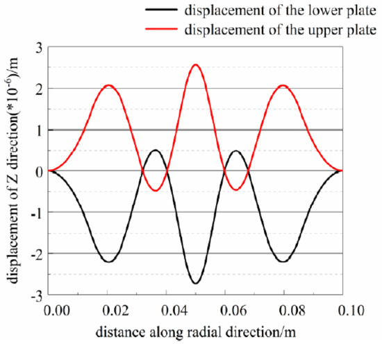 The third peak of the transmission loss appears at 415 Hz and the vibration response of the plate is shown in Figure 23. The transverse displacement of the circular plate varies with the radial direction, as shown in Figure 24. The sound pressure distribution of the cavity is shown in Figure 25. It is found that two plates vibrate in the same direction. In this case, fluid in the upper cavity is compressed but fluid in the lower cavity is stretched. The fluid in the middle cavity is stretched because the displacement of the upper plate is larger than that of the lower plate. At the same time, the influence of the two plates is partly counteracted.