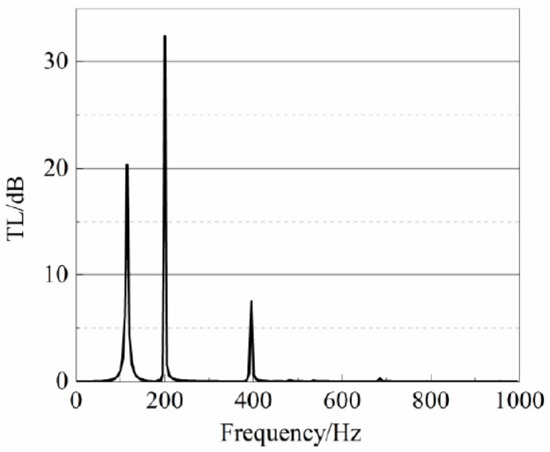 From Figure 8, it can be concluded that the periodic pipeline system develops lower peaks around 343 Hz and 686 Hz, as well as peaks close to the peaks of the cell transmission loss curve. The two mechanisms of the band gap formation of the acoustic pipe with periodic additions are the resonance of single-cell and Bragg scattering [24]. The reason why the peaks of the cell are close to the resonant frequencies of multiple local resonant cavities is the resonant mechanism of multiple local resonant cavities. The other frequencies of the stopband caused by Bragg scattering can be derived by: