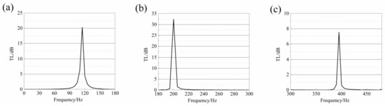 Enlarged view of the peak transmission loss of single cell of multiple local resonant cavities acoustic duct with three plates and masses. (a) Enlarged view of the peak at 115 Hz. (b) Enlarged view of the peak at 200 Hz. (c) Enlarged view of the peak at 395 Hz.