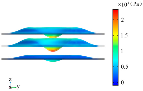 From Figure 35 and Figure 36, it can be observed that three plates vibrate in the same direction. The vibration displacement of the top plate is the largest and the displacement bottom plate is the smallest. Due to the difference in the vibration displacement of the three plates, their volumes change dramatically. The volumes of the upper two cavities are suppressed and the lower two volumes are stretched. The change in the four volumes leads to the changing shape of the springs. Energy is stored while the spring–mass system, formed by cavities, necks, and plates with mass, vibrates. The sound pressure in the square duct reduces after the multi-local resonant cavity and a peak appears in the transmission loss curve.