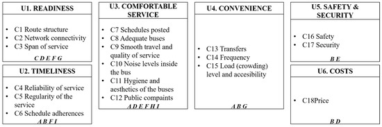 Nowadays, according to Tirachini and Cats [14], hygiene and sanitary protocols have gained importance within buses as a measure to protect people and mitigate the spread of the coronavirus disease (COVID-19) pandemic. One user may consider the bus clean if there is no garbage, however for another user the cleaning should consider strict cleaning and disinfection protocols in every space and seat inside the bus. Furthermore, higher fares are not usually well accepted and users express complaints about the service in opposition to the new prices, in most cases they are mainly linked to the comfort, punctuality and convenience criteria [13,15].