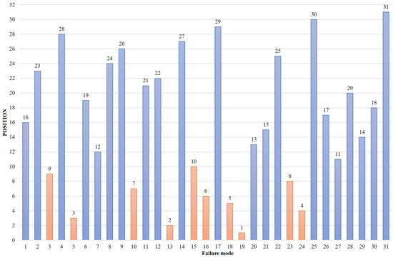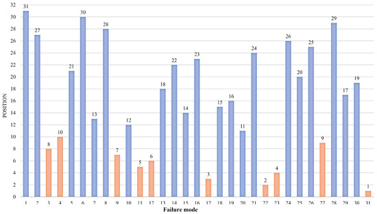 To compare the results versus the proposal, a variation with Multi-Objective Optimization Method by Ratio Analysis (MOORA) presented by Pérez-Domínguez et al. [41] was developmented for the same 31 failure modes under the same conditions and values, only the mathematics’ for convergence the analysis is different, the Table 14 and the Figure 4 shows the results for variation with Pythagorean Fuzzy MOORA.