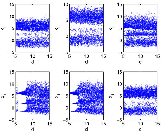 The bifurcation versus parameter can illustrate their chaotic characteristics such as the initial value sensitivity. Let , and d vary from 5 to 15, the bifurcation graphs on the evolution of the variable of six subsystems according to parameter d are exhibited in Figure 1. It can be seen that every subsystem appears its bifurcation, ergodicity and pseudo-randomness in the range of parameter d, and they are all chaotic when . Furthermore, because Lyapunov exponents can exhibit initial value sensitivity from another point, which indicate the degree of trajectories separation in distinct directions according to time iteration, Lyapunov exponent spectrums is given in Figure 2. Let and b vary from 0 to 50, the corresponding Lyapunov exponent spectrums for and of the six subsystems versus parameter b are exhibited. It appears the conditions of , and , then two positive Lyapunov exponents with the increase of b, which suggest that the subsystems go through periodic state, chaotic state, and are all hyperchaotic after the value of b which is less than and close to 20. It is noted that the absolute values of two positive Lyapunov exponents are far less than that of the fourth one which is negative, here we only show the first three Lyapunov exponents.