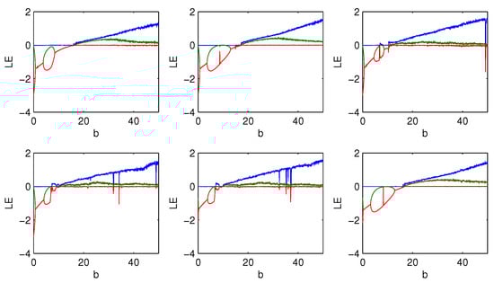 The Lyapunov exponent spectrums of six subsystems with versus parameter b.
