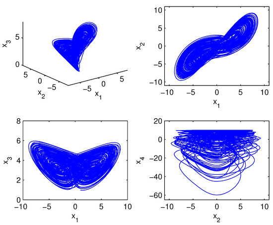 When setting and , it has five equilibrium points , . The class of equilibrium points can be determined by calculating the eigenvalues of the corresponding Jacobian matrix J and be listed in Table 2. Furthermore, the system (3) is hyperchaotic by getting calculated Lyapunov Exponents (LE) , respectively, and Lyapunov Dimension (LD) . Figure 3 shows its beautiful hyperchaotic attractor when the parameters are set as above. It exhibit the projections of two-scroll hyperchaotic attractor to 3D space and 2D planes , , and the classical “butterfly wings” appears in phase diagram of .