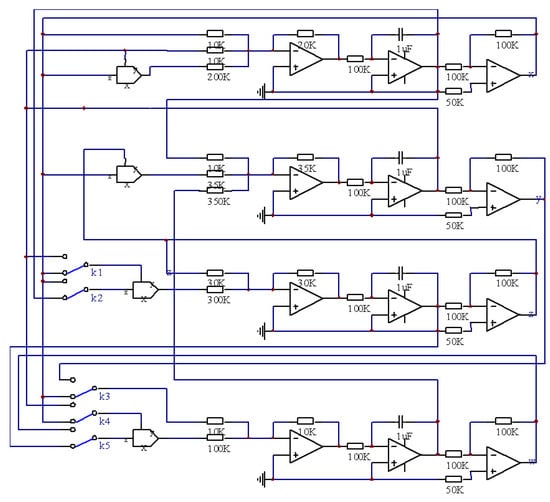 It is concluded from the analysis above that the zero equilibria of six subsystems are all USNP and the nonzero equilibria are all USFP. Moreover, all subsystems are hyperchaotic systems, although they have evolution differences led by the nonlinearity, they are so closely linked that they can be realized in a circuit by switching. In the following, a real circuit which can function as a switched system made up of six hyperchaotic subsystems is designed as is shown in Figure 4 according to (2) for the application. The transformation between nonlinear functions of the subsystems can be accomplished by switching, which can be operated easily according to certain rules to realize the functions of six hyperchaotic systems. By choosing proper component parameters and switching rules, the switched system can be implemented conformably. In Figure 4, the operational amplifiers are all LF353, the values of all components dependent on the system parameters are marked, respectively, the unit of every resistance is and the analog multipliers are selected as AD633JN to generate quadratic functions. If the k1 and k2 keys are toggled simultaneously, the nonlinear terms and are switched, also is changed to , so that the switching between subsystem (a) and (d) is accomplished. Other switchings can be implemented in this way too.