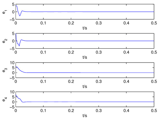 where . Based on (12), . Furthermore, by using Barbalat’s Lemma, that is to say the error system (10) is asymptotically stabilized to zero. Then the switched systems (8) and (9) achieve synchronization under the control strategy (13). □