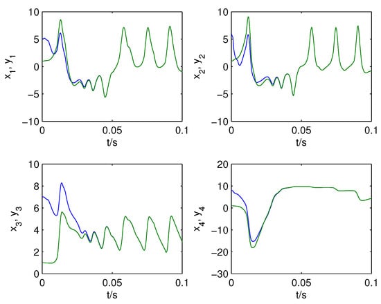 Theorem 1 ensures that the synchronization of switched systems is achievable. It is noting that in the actual application of secure communication, the driving switched system needs to switch between multiple subsystems to ensure the safety of information transfer, while the response system can be fixed without changing. In this way, the process of information reply and the controller design for specific system can be simplified. Therefore, chaos synchronization between presented driving switched system and a response hyperchaotic system is discussed in the following. If the switched system is in the same mode as the response system, it means one-to-one chaos synchronization, otherwise it means many-to-one chaos synchronization.