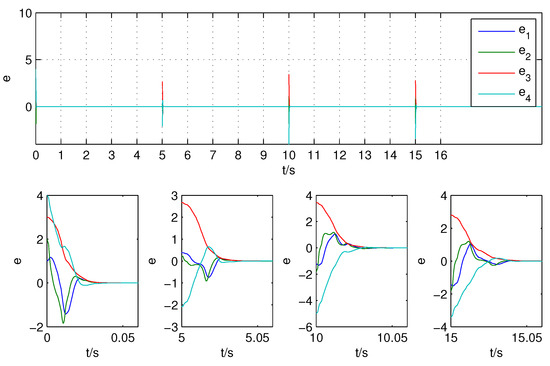 Second, change the driving switched system among hyperchaotic systems (a), (c), (d), (e), (f) by shifting switches every 5 second, and change the initial condition of response system to , then the error curves of response system (15) and the switched system can been observed in Figure 7. The first figure in it shows the synchronization error of subsystem (a) and response system fast converge to zero and there are only small amplitude fluctuations every 5 second. Simultaneously, the synchronization error states are fast stabilized to zero too when subsystem is switched to (c), (d), (e), (f), respectively, which are shown in Figure 7 from left to right. The result of simulations means that many-to-one chaos synchronization is stabilized.
