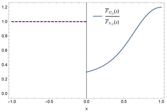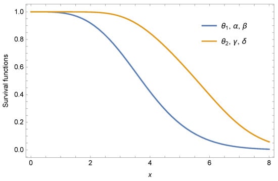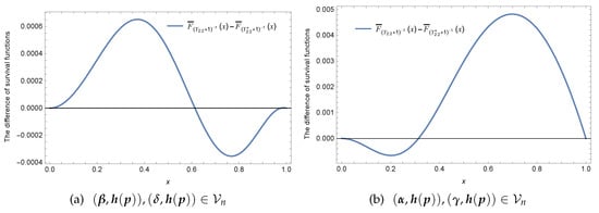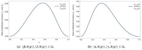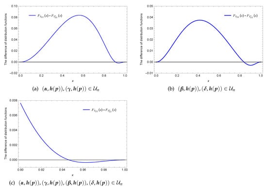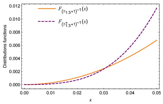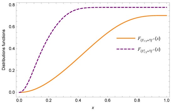 (i) Let , , and . Then, and . In this case, the distribution function is displayed in Figure 6a, which implies that the usual stochastic ordering does not hold between and .