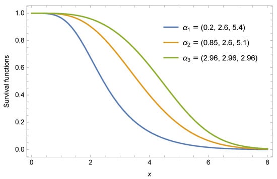 where , , and , and we give the curves of the reliability function under the different parameters vectors as shown in Figure 8. Figure 8 indicates that the weaker heterogeneity among shape parameters according to the weak majorization order leads to larger reliability of the series systems. Therefore, a reliability design engineer can use the results to assess the reliability performance or increase the availability of a series system with dependent components.