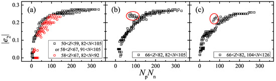 In Figure 1, the absolute value of in the Nilsson perturbed–spheroid parameterization taken from Ref. [38] is presented versus for nuclei in three different regions [34]. Here only of nuclei with known experimental binding energies [22] are plotted. As discussed in Ref. [34], the correlation between and shown in Figure 1 is very compact, except for several anomalies which are labeled by the red circles in Figure 1a and marked by a red circle in Figure 1b,c.