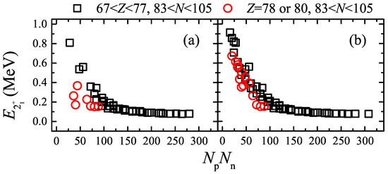 The scheme was described by Casten, where , and for even–even nuclei exhibit smooth systematics against the product of valence proton number and valence neutron number [31,36,37]. It works equally well for the quadrupole deformation parameter (correlated with the intrinsic quadrupole moment) of all parity types of medium-heavy nuclei in Ref. [34].
