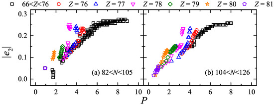 Similarly in Ref. [41], the relationship between [40] and the P factor is presented in Figure 4a for even–even nuclei with and . The black squares correspond to nuclei with , and isotopes with , 78 and 80 are labeled by colored dots. It is obvious that the deviation between those colored dots and the black squares becomes larger with the increase in Z. This phenomenon also appears in the relation between , [40] and the P factor, as shown in Figure 5a,c.