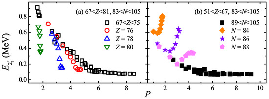 In Ref. [41], is further discussed with the P factor, i.e., , in the same region of Figure 1b,c. in the Nilsson perturbed–spheroid parametrization [38] is plotted versus the P factor in Figure 3, where nuclei with are labeled by black squares, and isotopes with are labeled by colored dots. With the increase in factor P, grows smoothly and becomes flat around [41].