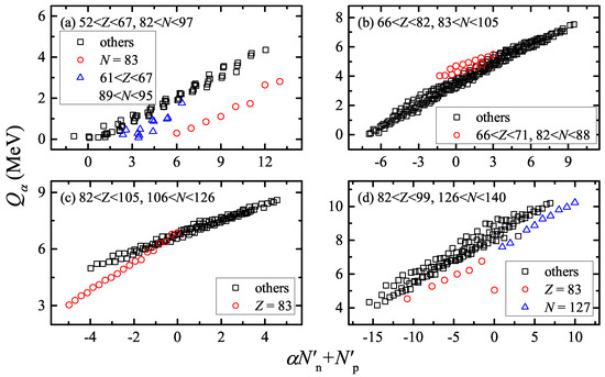 In addition, by comparing Figure 3 with Figure 1b,c, and Figure 4a with Figure 2b, it is easy to see that the anomalies for nuclei with are more conspicuous in the P factor plot than in the scheme for both and , and behave in a pattern with the proton number Z in the P factor plot [41].