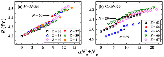 The nuclei with fm are labeled in Figure 10, and these anomalies can be divided into three regions: (1) and or 62; (2) or 65 and or 91; (3) , or 110, and , or 108 [42]. These large deviations of are also consistent with the relation for R, as discussed in Section 2.2 [42].