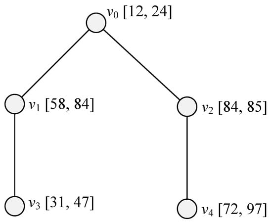 In [8], it has been proved that the considered algorithm is an approximation algorithm with a constant approximation ratio not greater than 2. The proof from [8] is valid for general graphs, and can therefore be applied to trees. Our estimate for computing time is specific for trees, and it comes from the fact that the associate conventional problem (with the average scenario) can be solved by the linear-time algorithm from [17]. Note that the algorithm from [17] also works correctly when vertex weights are non-negative real numbers. To complete the proof, one must demonstrate that the general approximation ratio 2 from [8] cannot be improved for trees. We do this by presenting our own original problem instance involving a tree, where the algorithm returns a solution such that is exactly equal to . Indeed, our problem instance is specified by Figure 2. The figure shows a tree consisting of five vertices, each with a given interval for its weight. □