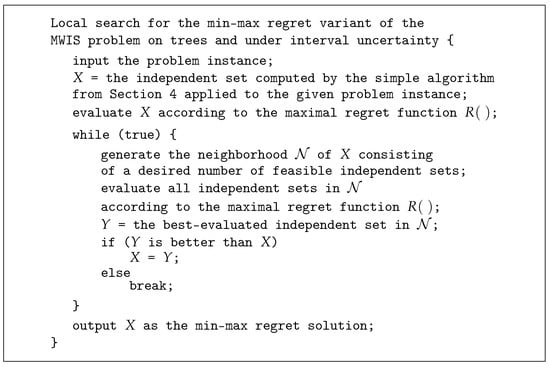 The outline of our extended algorithm is described by the pseudo-code from Figure 3. The code obeys the standard local-search strategy developed, e.g., in [20,21]. Thus, for a given robust MWIS problem instance the algorithm first finds an initial solution, i.e., a feasible independent set. In our case the initial solution is constructed by invoking the simple algorithm from the previous section. Next, the initial solution is repeatedly improved, thus producing a series of current solutions. In each iteration, the algorithm generates a neighborhood, which consists of various feasible perturbations of the current solution. All independent sets in the neighborhood are evaluated according to the maximal regret function . The best member of the neighborhood (i.e., the one whose maximal regret is minimal) is identified. If that member is better than the current solution (i.e., its maximal regret is smaller), it becomes the new current solution and the algorithm resumes with a new iteration. Otherwise, the algorithm stops. The last current solution is regarded as nearly optimal (according to the min–max regret criterion).