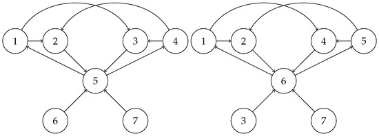 If a vertex has outdegree zero, then it has no vertices of distance away from it. Hence, the only label that could contribute to the sink’s weight would be the label on the vertex itself. Thus, . In addition, if two or more vertices were of outdegree zero, then their weights would not be equal as the only contributing values would be the label on that vertex and vertex labels are not repeated. Finally, if any vertex other than the sink had label n, then the weight at that vertex would be at least n, while the sink’s weight would be no larger than . This is a contradiction as all the weights must be equal. Hence, the sink must have label n and thus, the magic constant of any graph with a sink is n. □