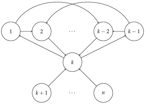 Figure 3 gives the construction technique for any n. All vertices with labels between 2 and are directed towards the vertex labeled k. All vertices with labels between and n are also directed towards the vertex labeled k. The vertex with label k can be directed towards the vertices labeled 1 and . Finally, the vertices 1 and are directed towards the vertices labeled 2 and . □