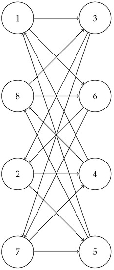 Let be the complete bipartite graph with partite sets and . Note that has vertices. First, we group the vertices within each partite set into pairs. In A, this would give sets and . Within each set of two, label one vertex s and the other vertex for . This would give a sum of for each set of pairs. Then, orient the edges in the following way: vertices in will be oriented to vertices in the sets and vertices in will be oriented to vertices in the sets where all additions are done modulo . Thus, each vertex is oriented towards pairs of vertices and hence each vertex is oriented towards vertices. This gives a total of edges and thus each edge is accounted for and has only one orientation. This gives a magic constant of for any . The magic constant would be for any union of two sets, for any union of three sets, and for the union of all four sets. Figure 4 gives an example of this labeling when . □