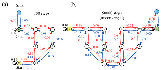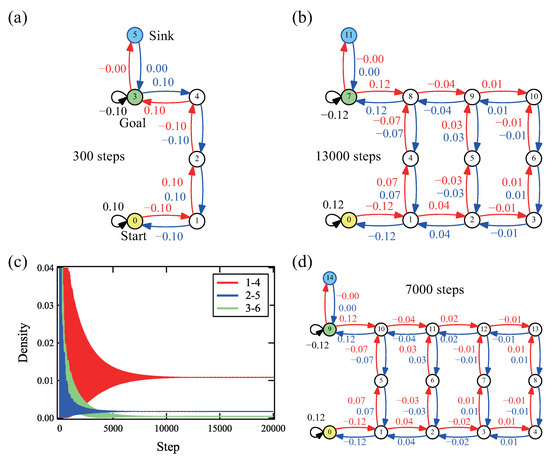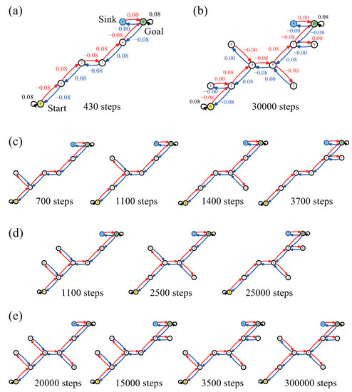 Figure 3c–e shows the results for patterns of placement of one to three dead ends, respectively. The distribution of the amplitudes is omitted, but ±0.08, which is the same as Figure 2c,e,f, is on the correct path, and 0.00 is on the dead-end edges in all cases. The convergence steps varied not only by the number of dead ends but also by the positions. As the trend shows, the convergence steps became larger with increasing dead ends; however, exceptions were observed depending on the positions of the dead ends. The convergence steps became larger for the case where dead ends were attached closed to the goal node. This seems counterintuitive considering the quick convergence near the sink, which was observed in Figure 2d.
