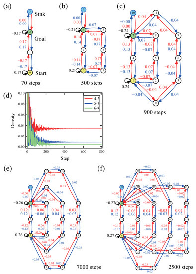 Figure 4d shows the time profiles of the edges on each path. The speed of convergence was higher than in the case of other structures of a similar scale. The reason for this is unclear, but a lack of branching on the paths may be responsible for the high speed. Among the three paths, the speeds of convergence did not differ significantly, and they did not depend on the distance from the sink unlike in the tree-like structure. In general, the convergence steps increased by the addition of other paths. However, a counter-intuitive decrease of the convergence steps was observed in Figure 4e,f.