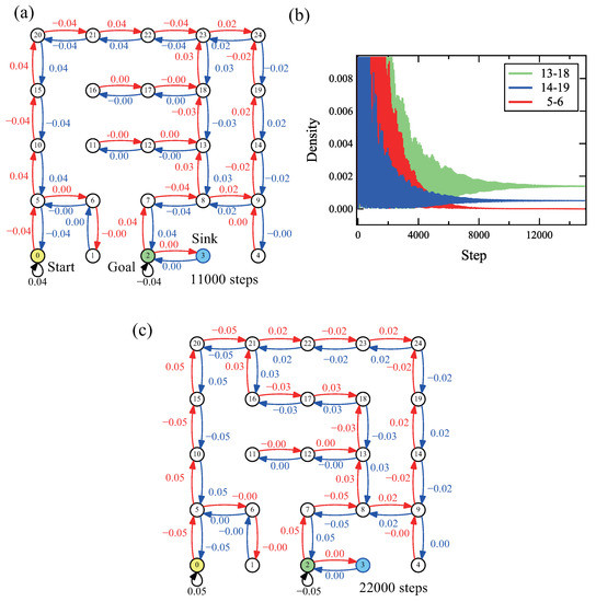 To demonstrate slightly complicated cases, solutions of small mazes by the method are presented. The maze includes some dead ends and two paths to the goal as shown in Figure 6a. As in the other related cases shown above, the maximum density remains on the shortest path, and the densities of the dead-end paths vanish. The maze-solving worked correctly for a small maze with both dead-ends and cycles.