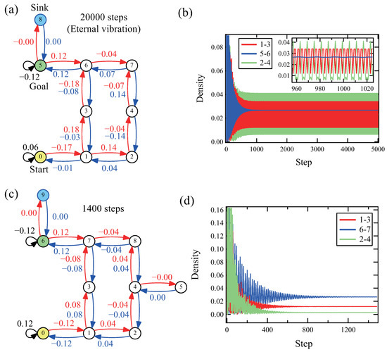 Even though the odd cycle was not involved in the network, undesirable eternal vibration was observed in some cases. Figure 8a shows the network of the ladder-like structure for L = 2, which is exhibiting eternal vibration. In this case, only the edges between nodes 5 and 6, were stabilized. The amplitudes of other edges, from the start to the cycle, exhibit a constant vibration pattern eternally. Figure 8b shows the time profiles of the densities of some edges. The constant amplitude vibrations seem to continue eternally and not converge. The inset shows the details of the vibrational behavior. The same patterns are seen to be repeating. The eternal vibration was observed only for the ladder-like structure of L = 2 and 5.