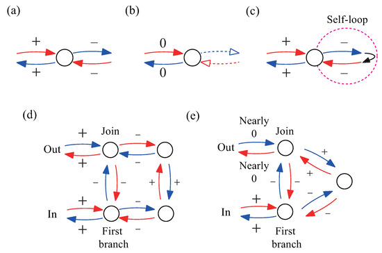 Figure 9c shows an example of amplitude distribution around a self-loop. In this case, the amplitude on the self-loop acts as both incoming and outgoing amplitudes to keep the sum zero for both. This is the reason why the signs of the amplitudes are the same on the edges connected to the node involving the self-loop. These facts fit all the nodes included in the numerical results after convergence.