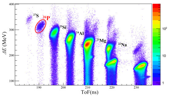The particle identification was done by the combination of energy loss (), time of flight (ToF), and magnetic rigidity (), shown in Figure 1, according to the LISE++ simulation [18]. The ToF was measured by two plastic scintillators (T1,T2), and the was measured by two silicon detectors (1, 2). The correlations using energy and time signals were applied to acquire the valid number of implanted P ions from contaminants.