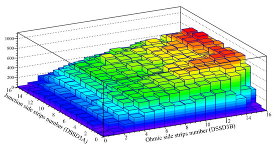 In continuous beam mode, the nuclei of interest were stopped by DSSDs. The total thickness of Al degraders in this experiment was set as 220 m so that the proportions of P ions stopped in DSSD2 and DSSD3 were approximately equal. The high energy calibrations of three DSSDs could be performed by the secondary beam combined with LISE ++ calculations [18], and then the particle energies were converted to the implanted depths using the SRIM program [25]. The secondary beam was scattered through multiple sets of Al degrader, making the distribution of P more uniform across the silicon surface. Figure 2 shows the surface distributions of P implanted on DSSD3 in the x-y axis. The stopped position of each P particle could be determined by the x-y information to obtain the original position of each decay particle. The total number of P implantations in DSSD1, DSSD2, DSSD3 were 6954, 139,308, and 139,801, respectively.
