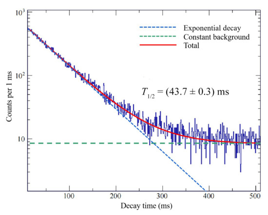 Each DSSD was divided into 16 × 16 pixels, and the correlations were based on the time difference between the implantation events and the decay events recorded in the same pixel. The decay-time spectrum is shown in Figure 3. Most of the implantation events were correlated with the decay events under the high implanting rate beam condition, except for a relatively small number of noise or background events which would form a constant background on the decay-time spectrum. The fitting was performed by Maximum Likelihood Fitting (MLF) [26]. The fitting expression is shown in the following:
